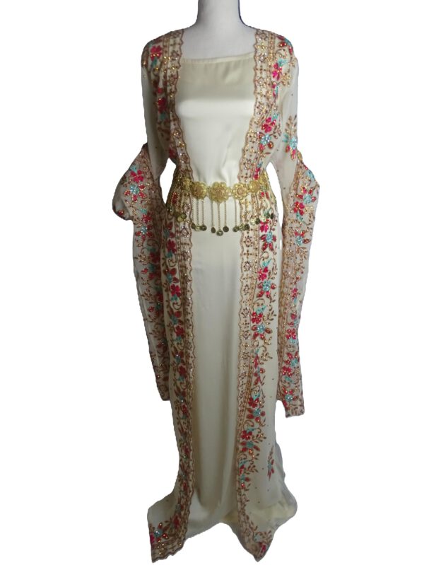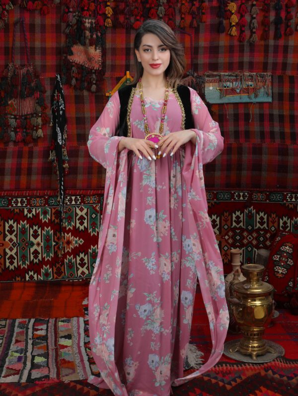 Dieses bezaubernde kurdische Kleid aus luftigem Chiffon strahlt pure Frühlingsfrische aus. Das florale Muster in zarten Pastelltönen verleiht dem Kleid eine romantische und verspielte Note. Der leichte Stoff umhüllt sanft die Silhouette und sorgt für einen fließenden, eleganten Look. Mit seinen langen, weiten Ärmeln und der schmeichelhaften Passform ist es die perfekte Wahl für besondere Anlässe, bei denen eine feminine und natürliche Ausstrahlung im Mittelpunkt stehen soll. Ein Kleid, das Leichtigkeit und Tradition kunstvoll vereint.