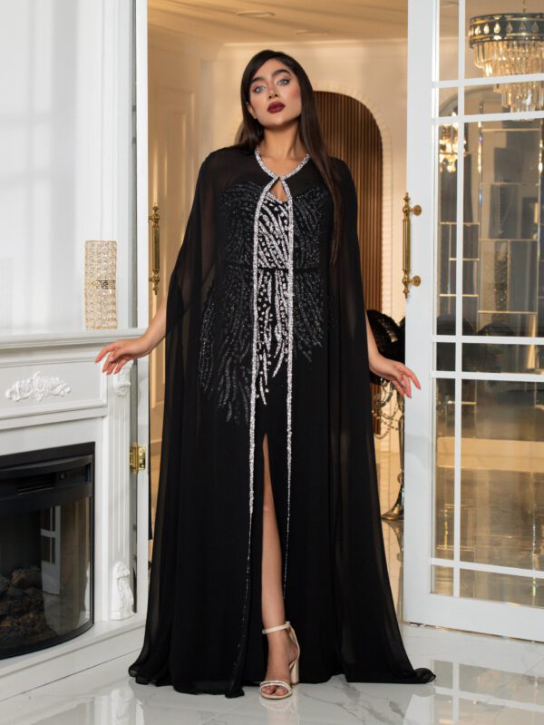 Stilvolles Design:Der raffinierte Drapierungseffekt auf der Vorderseite umschmeichelt Ihre Figur und sorgt für eine schmeichelhafte Silhouette. Das Highlight dieses Kleides ist das elegante Chiffon-Cape, das sanft über die Schultern fällt und bei jeder Bewegung einen Hauch von Geheimnis und Glamour versprüht.
