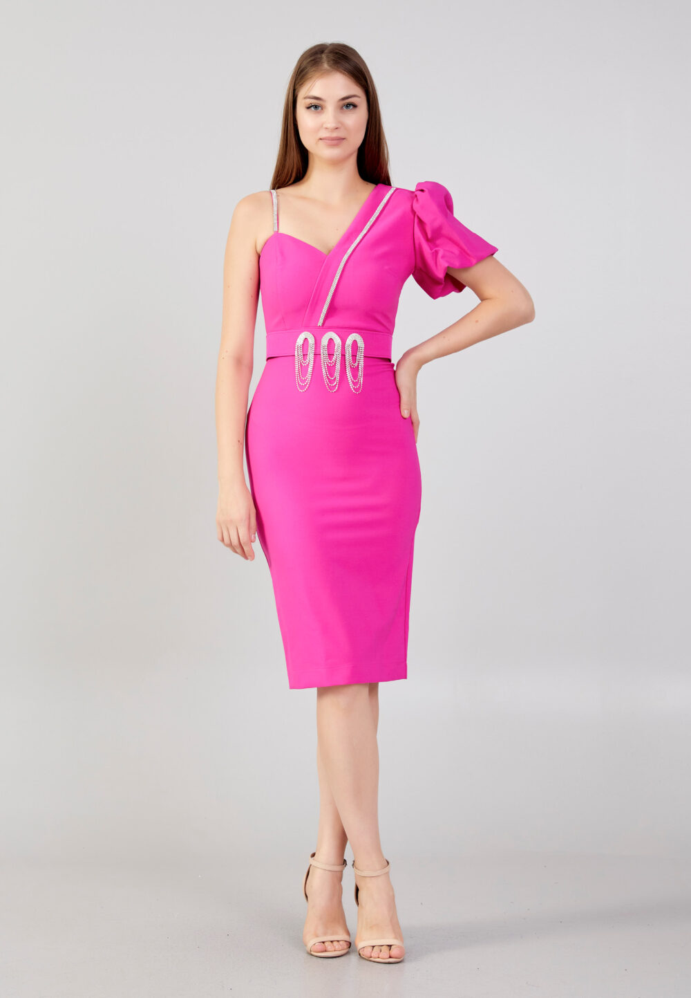 Setze ein Statement mit diesem auffälligen pinken-Fuchsia Kleid. Die asymmetrische Schulter mit Puffärmel und die funkelnden Details verleihen dem Kleid eine extravagante Note. Der figurbetonte Schnitt sorgt für eine elegante Silhouette, perfekt für besondere Anlässe und Partys.