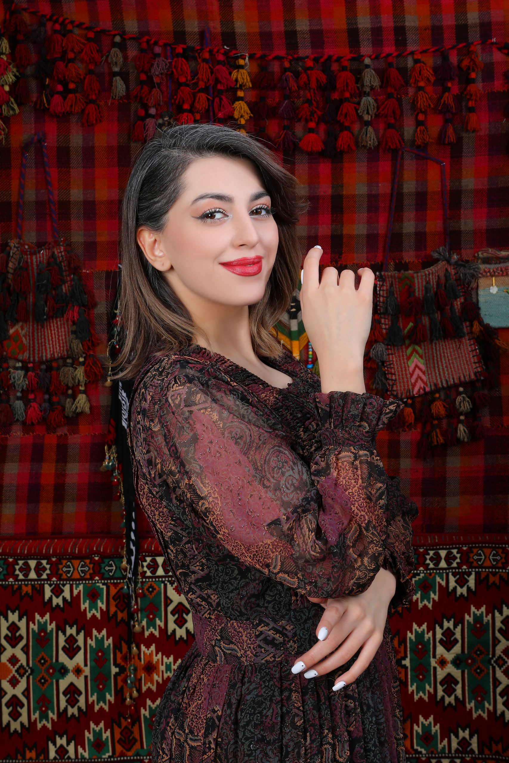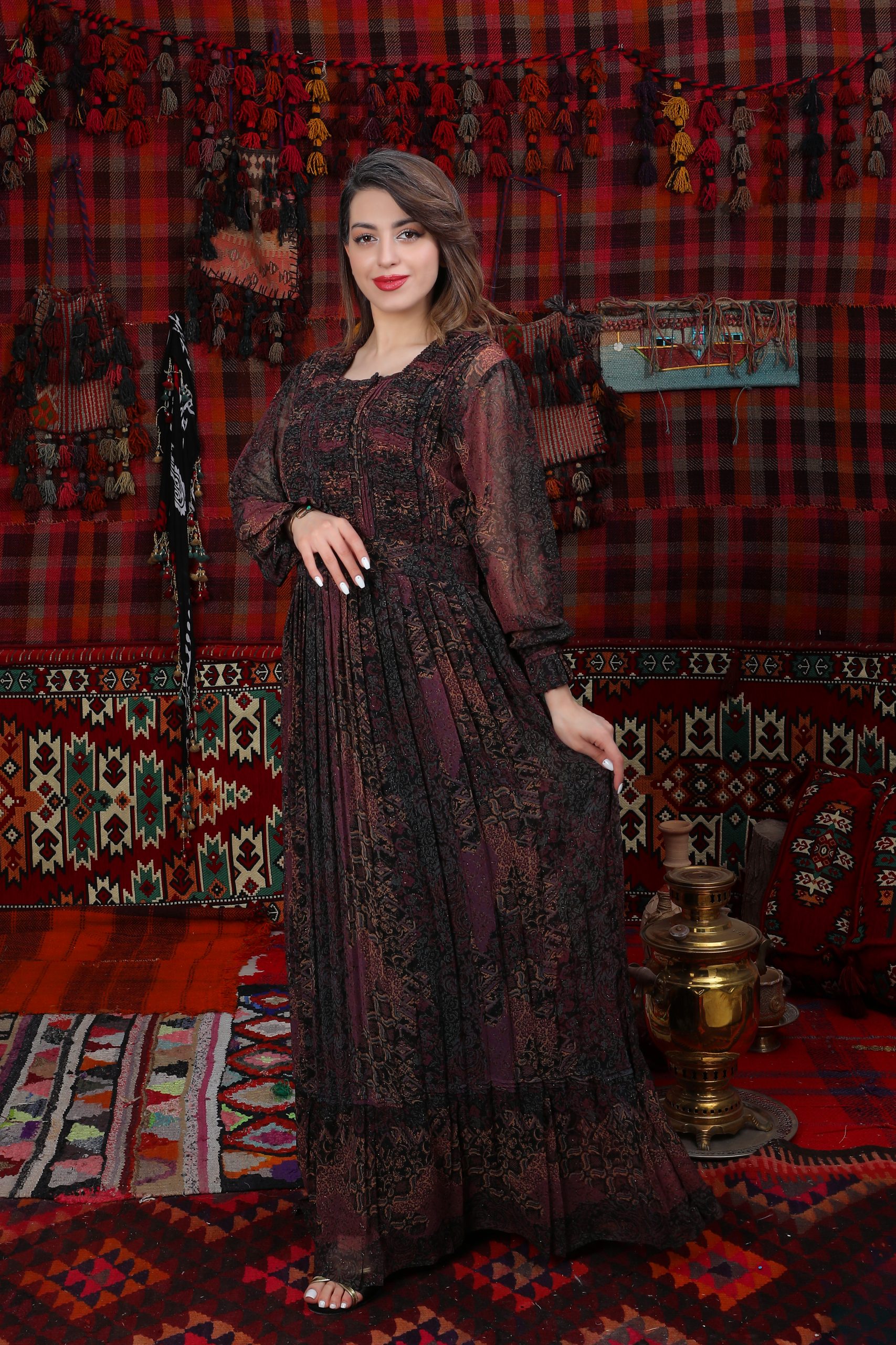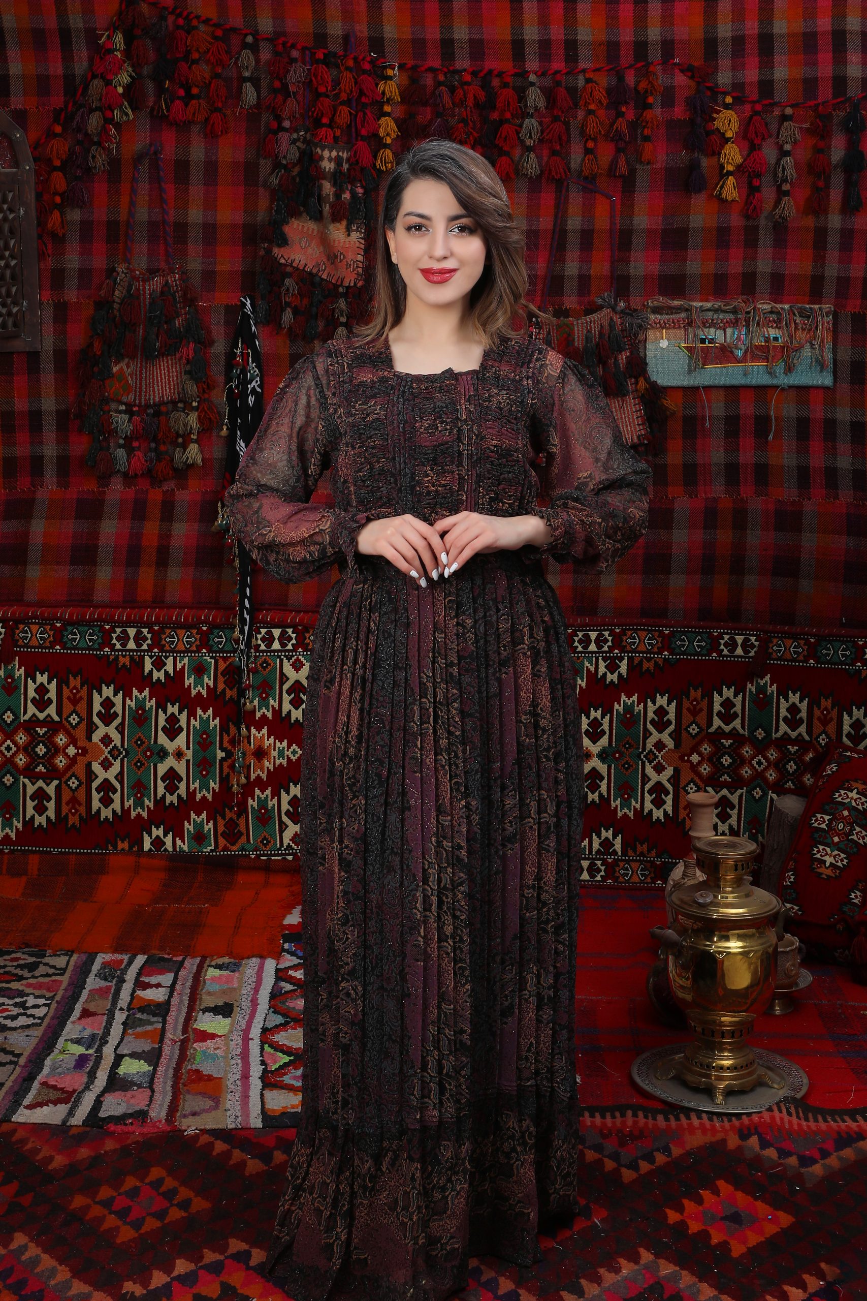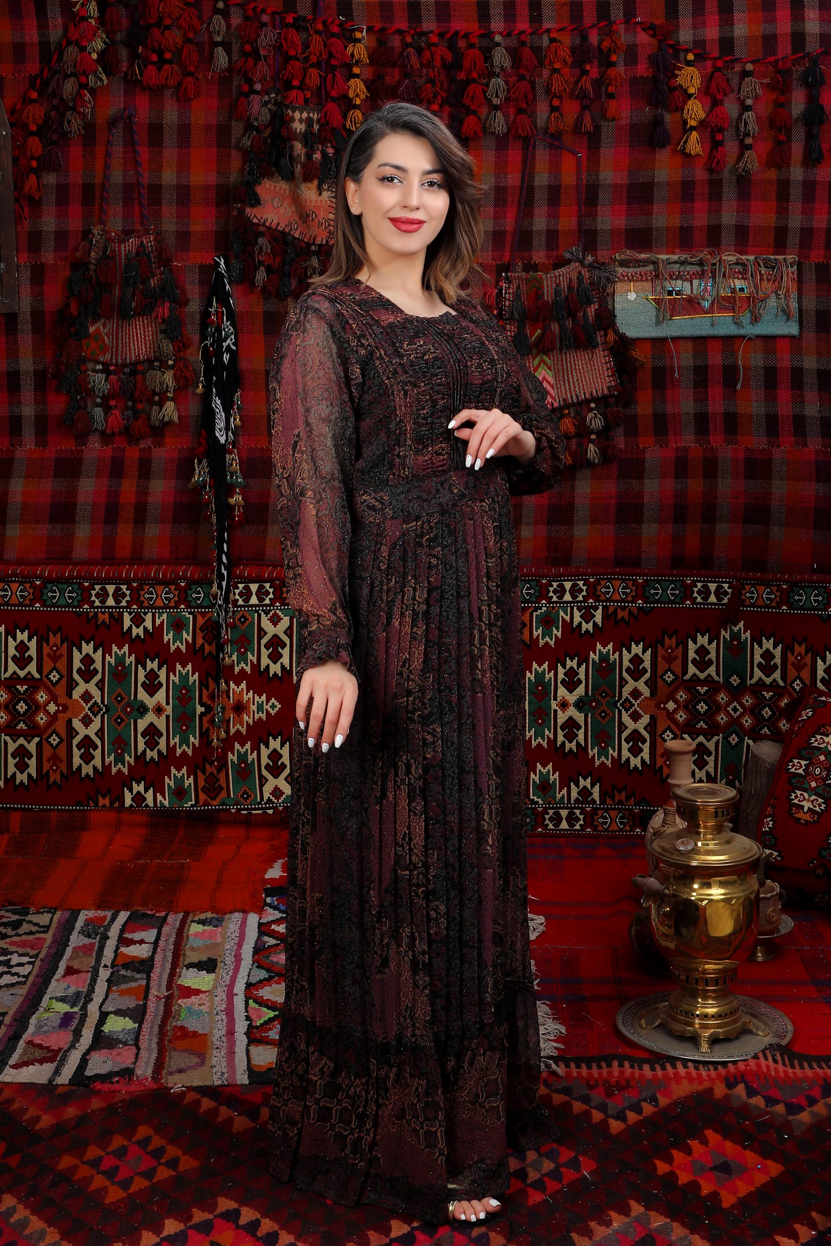 Das Kleid „Meyro“ im Efrin-Stil kombiniert fließenden Chiffon mit tiefen Burgunder- und Schwarztönen in einem orientalisch inspirierten Muster. Der bodenlange, ausgestellte Schnitt mit langen Ärmeln sorgt für Eleganz und Bewegungsfreiheit, während ein integriertes Unterkleid Tragekomfort bietet. Sorgfältig von kurdischen Frauen gefertigt, spiegelt diese eveyamin-Design Tradition und Stil wider.