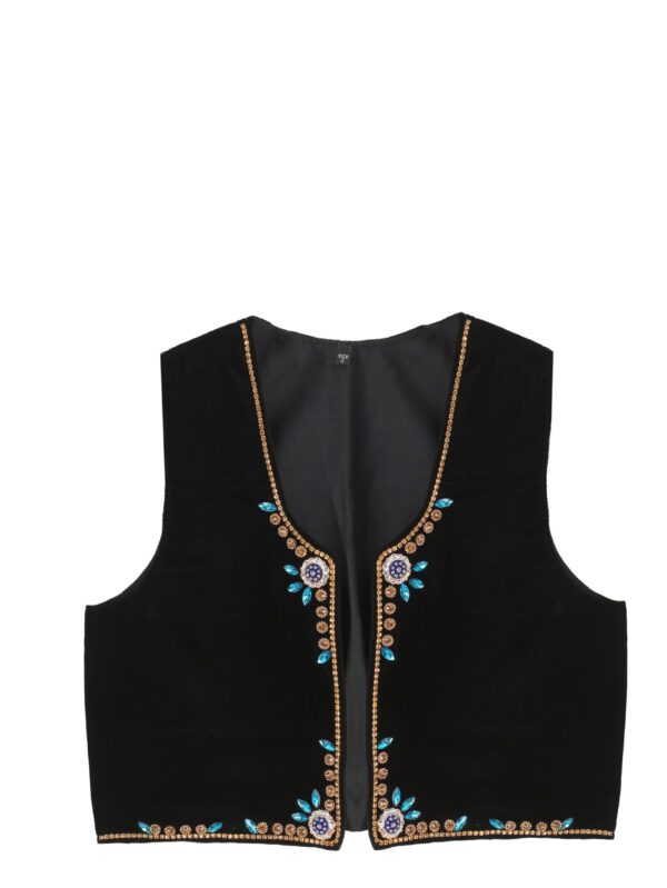 Das Kleid besticht durch seinen langen, fließenden Schnitt, der Eleganz und Würde ausstrahlt. Typisch für Efrîn ist die Kombination aus kräftigen Farben – oft Lila, Dunkelrot, Blau oder Smaragdgrün – in Verbindung mit handverzierten Details, glitzernden Mustern oder feinen Stickereien an Brust und Ärmeln. Ein breiter, verzierter Gürtel auf Taillenhöhe betont die Figur und rundet das Gesamtbild ab.