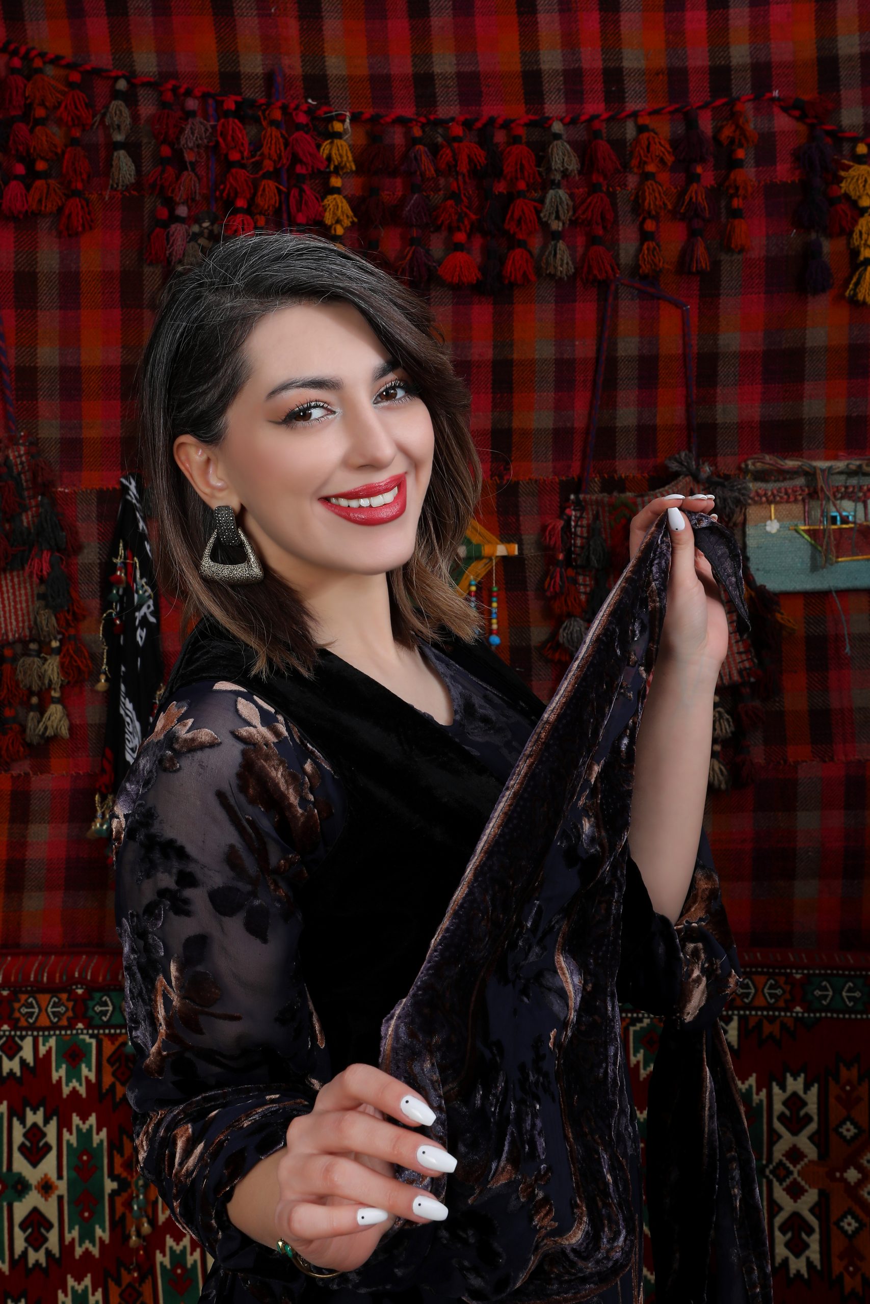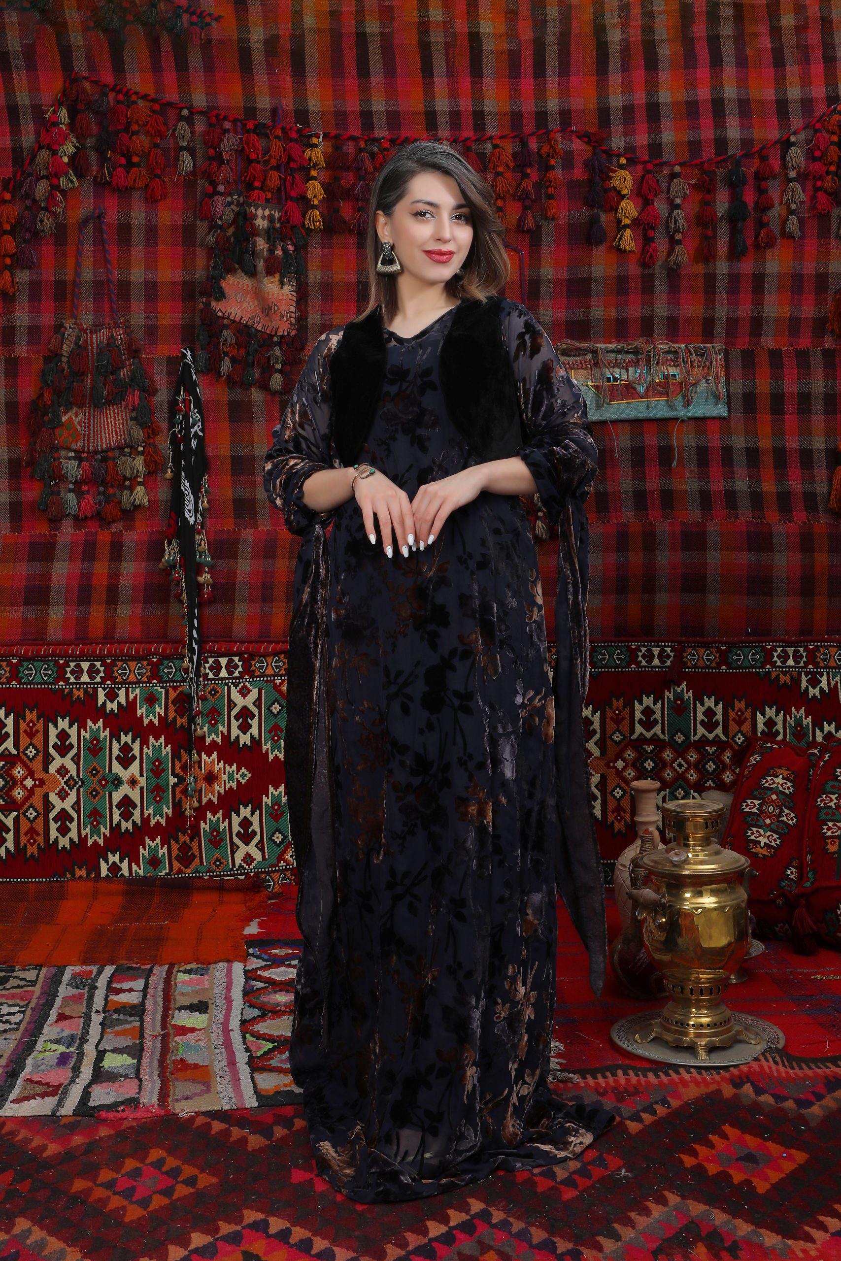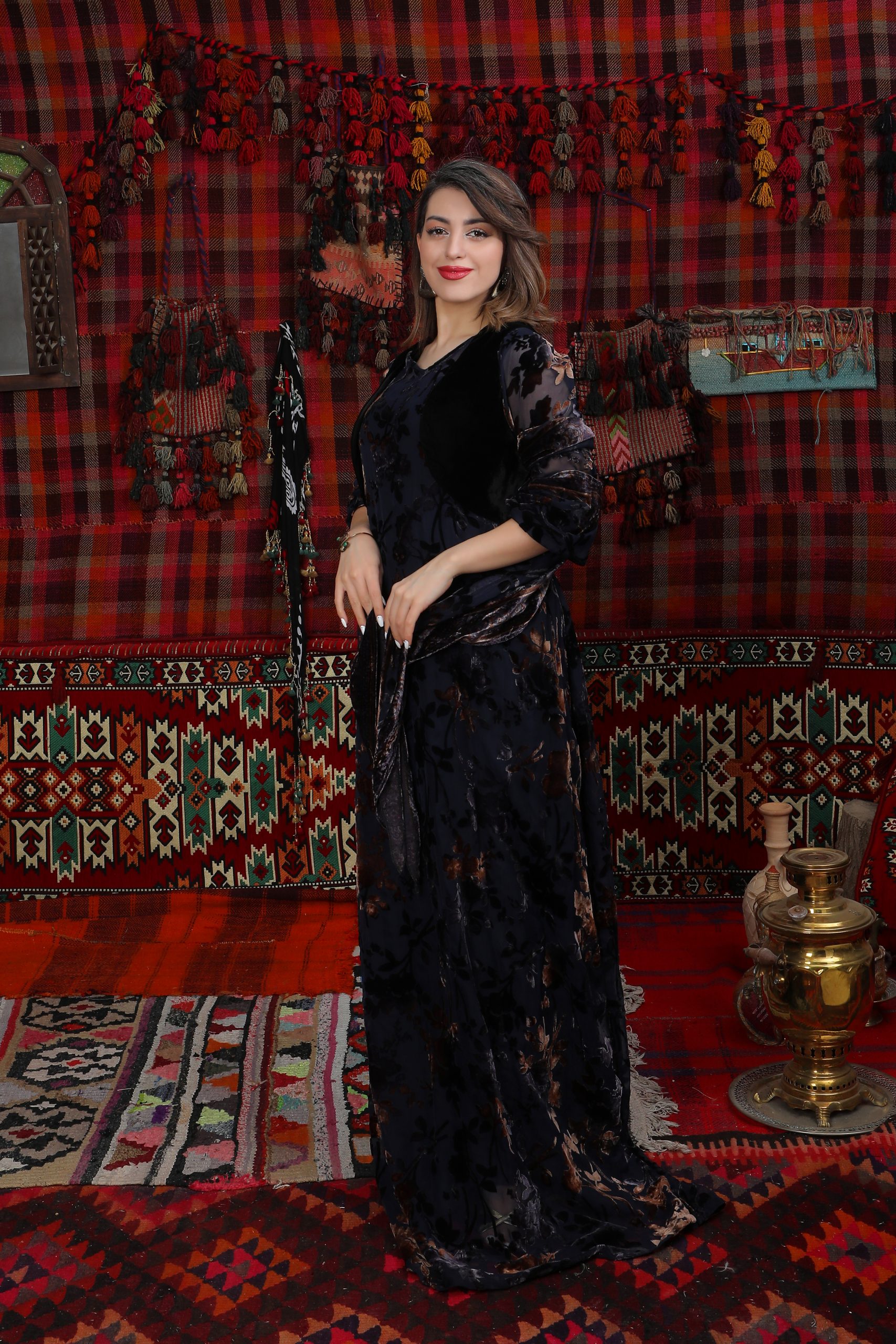 Dieses elegante Kleid mit Glockenärmeln besteht aus hochwertigem Tüll und Samt in Braun und Schwarz. Der fließende, bügelfreie Stoff verleiht dem Kleid einen luxuriösen Look und fällt wunderschön nach unten. Es lässt sich vielseitig kombinieren – ideal mit einer kurdischen Weste oder einem langen Kaftan (Xeftan). Handgefertigt von kurdischen Frauen, vereint es Qualität, Tradition und Eleganz.