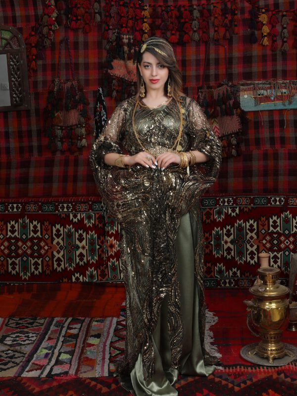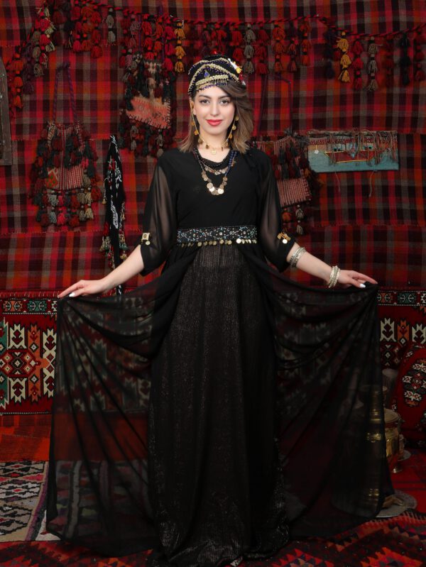 Das zweiteilige Kleid Feleknas von eveyamin besticht durch seine tiefschwarze Eleganz, veredelt mit schimmernden Pailletten auf dem transparenten Tüllumhang. Handgefertigt von kurdischen Frauen, entfaltet es seine volle Wirkung besonders in Kombination mit traditionellem Goldschmuck, wie ihn Kurdinnen tragen. Accessoires sind nicht im Lieferumfang enthalten.