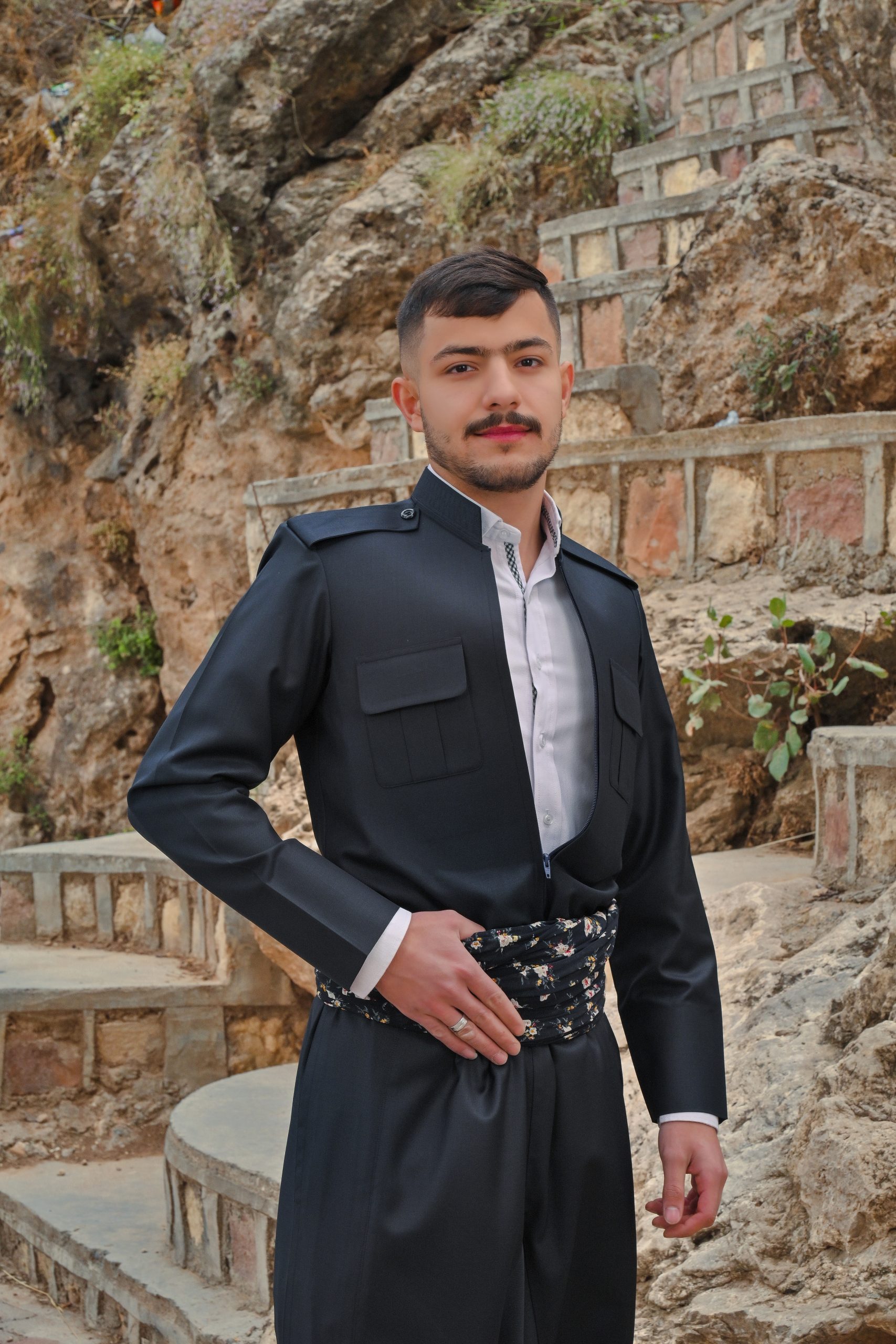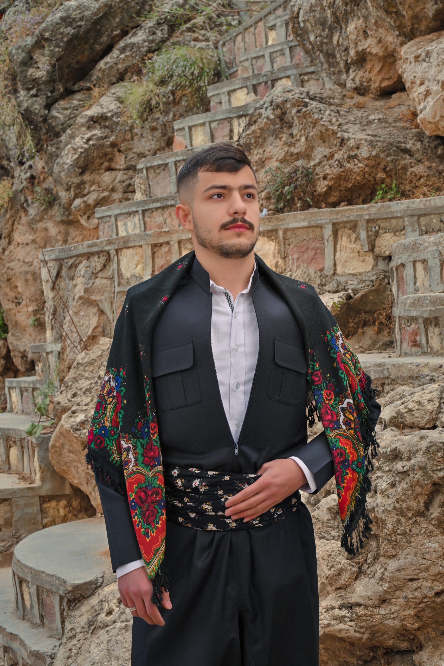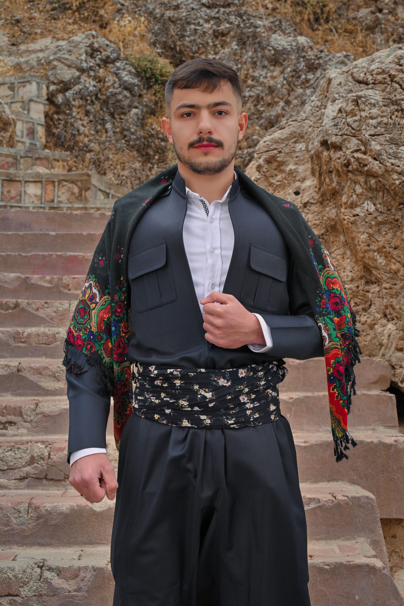 Typisch für die kurdischen Regionen wie Şax, Akrê, Duhok und Umgebung, besteht das Outfit aus einer locker geschnittenen Hose (Şal) und einem taillierten Oberteil (Şapik) mit feinen Knopfdetails. Der breite Stoffgürtel sorgt für Halt und bringt das Ensemble stilvoll zur Geltung.