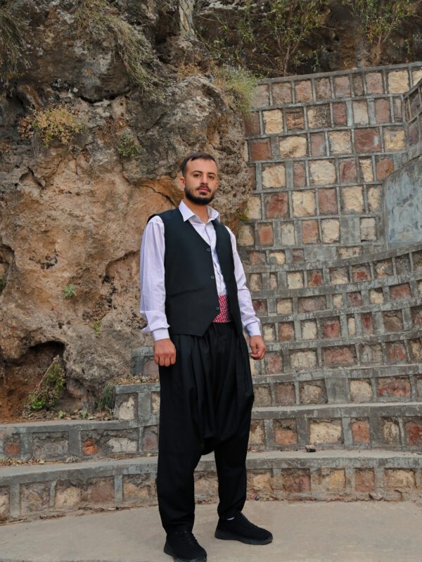 Typisch für die kurdischen Regionen wie Şax, Akrê, Duhok und Umgebung, besteht das Outfit aus einer locker geschnittenen Hose (Şal) und einem taillierten Oberteil (Şapik) mit feinen Knopfdetails. Der breite Stoffgürtel sorgt für Halt und bringt das Ensemble stilvoll zur Geltung.